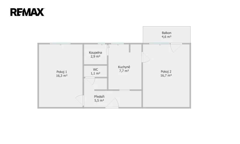 • 2 pokoje 16,3 m² a 16,7 m² – vhodné např. jako ložnice a obývací pokoj s balkonem