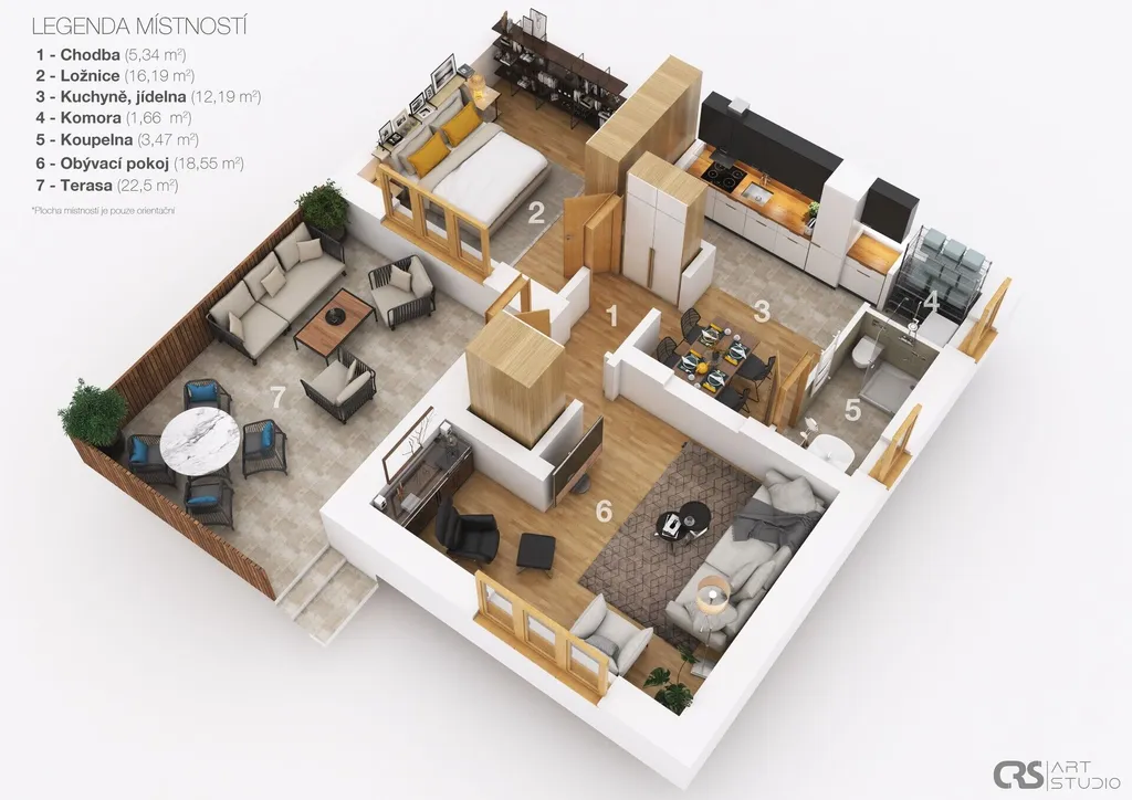 Na zahradu navazuje terasa o velikosti 22,5 m², orientovaná rovněž na jih, která je ideálním místem pro každodenní posezení, grilování nebo víkendová setkání s rodinou a přáteli. Velkou výhodou je také pohodlný vjezd na pozemek a vlastní garáž.