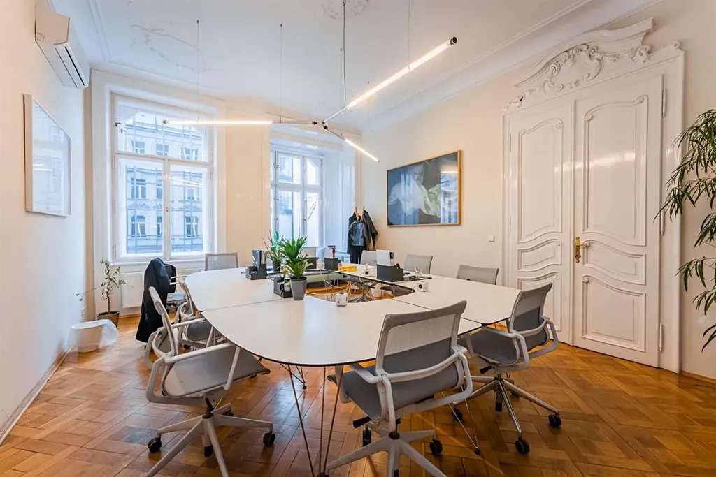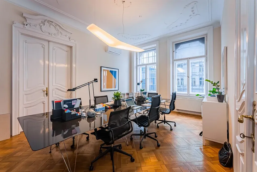 Reprezentativní kancelářské prostory 9+kk, o celkové rozloze 319 m2, se dvěma malými balkony, jsou situované ve 2. patře zrekonstruovaného secesního domu s výtahem v samotném centru města v ulici Na Perštýně, Praha 1 Staré město.