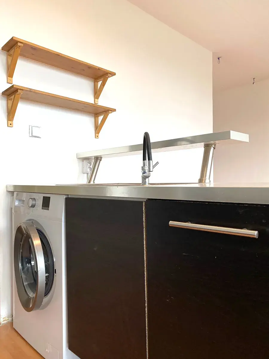 vstup do prostorné koupelny s rohovou vanou, umyvadlem a WC. Dále vstupujeme do hlavní místnosti obývací se zařízenou kuchyňskou linkou, obsahující spotřebiče lednice s mrazničkou, pračkou, dále horkovzdušná trouba, varná deska, digestoř. Dispozice obývací místnosti poskytují oddělenou spací část v