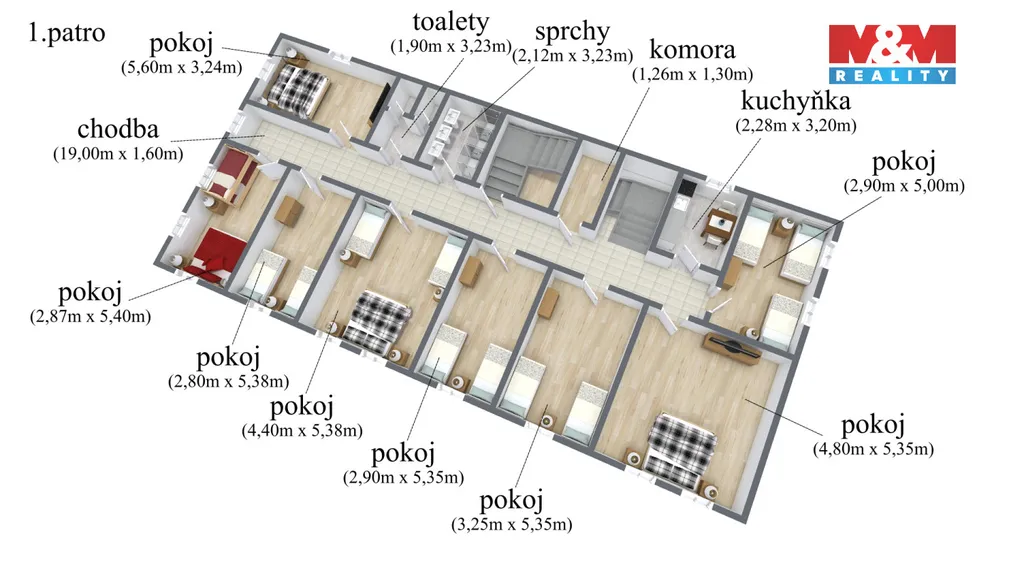 1. patro: 6 prostorných místností, které přímo vybízejí k přestavbě na 2–3 samostatné bytové jednotky.