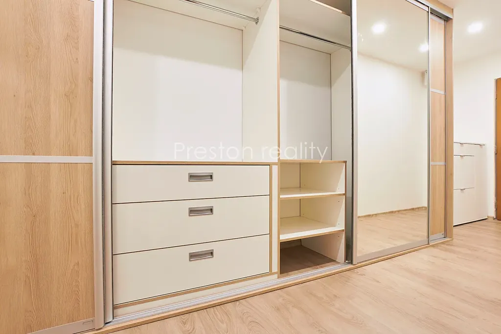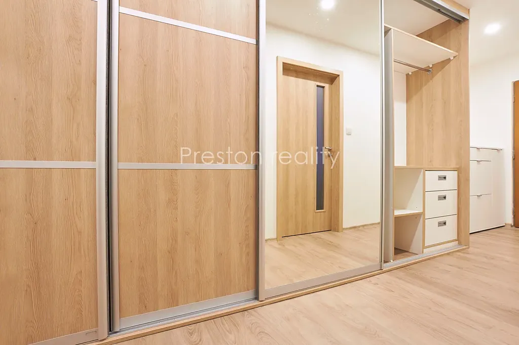 Byt se skládá ze 2 menších pokojů (10 a 7 m2) a obývacího pokoje s kuch. koutem (26 m2). Z většího pokoje je vstup na lodžii, pokoj lze vybavit manželkou postelí s matracemi 180x200 cm. Menší pokoj je vhodný jako pracovna či dětský pokojíček. Obývací pokoj byl propojen s kuchyní, která je vybavená moderní, plně vybavenou kuchyňskou linkou (indukční varná deska, digestoř s filtrem, myčka, el. trouba, mikrovlnná trouba, vestavěná lednice s mrazákem, pračka LG - 6 kg). Koupelna byla zařízena v nadstandardu s obklady značky RAVAK. WC bylo pro větší komfort zvětšeno posunem příčky (viz. plánek), vznikl tak užitečný kout pro odkládání úklidových prostředků. Mísa na WC je ve stylu Rimfree (konstrukce bez skrytých dutých prostor pro snadné čištění). Na chodbě je byt vybaven velkokapacitní skříní se 4 posuvnými dveřmi (2 se zrcadly).