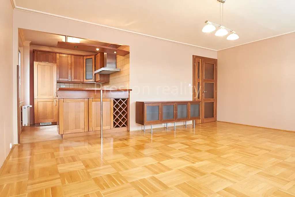 Byt se skládá z velkého obývacího pokoje (32 m2) a dvou pokojů – ložnic (13 a 16 m2), které jsou vybaveny skříněmi, z nichž jeden má vstup na prosklenou lodžii. Součástí obývacího pokoje je kuchyňský kout s vlastním oknem a s plně vybavenou kuchyňskou linkou (plynová varná deska, horkovzdušná trouba, myčka, lednice, mrazák, digestoř). Na podlahách všech hlavních místností jsou pěkné dřevěné parkety.