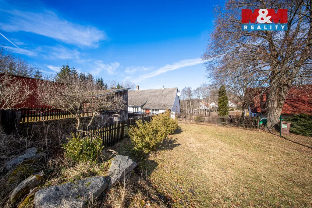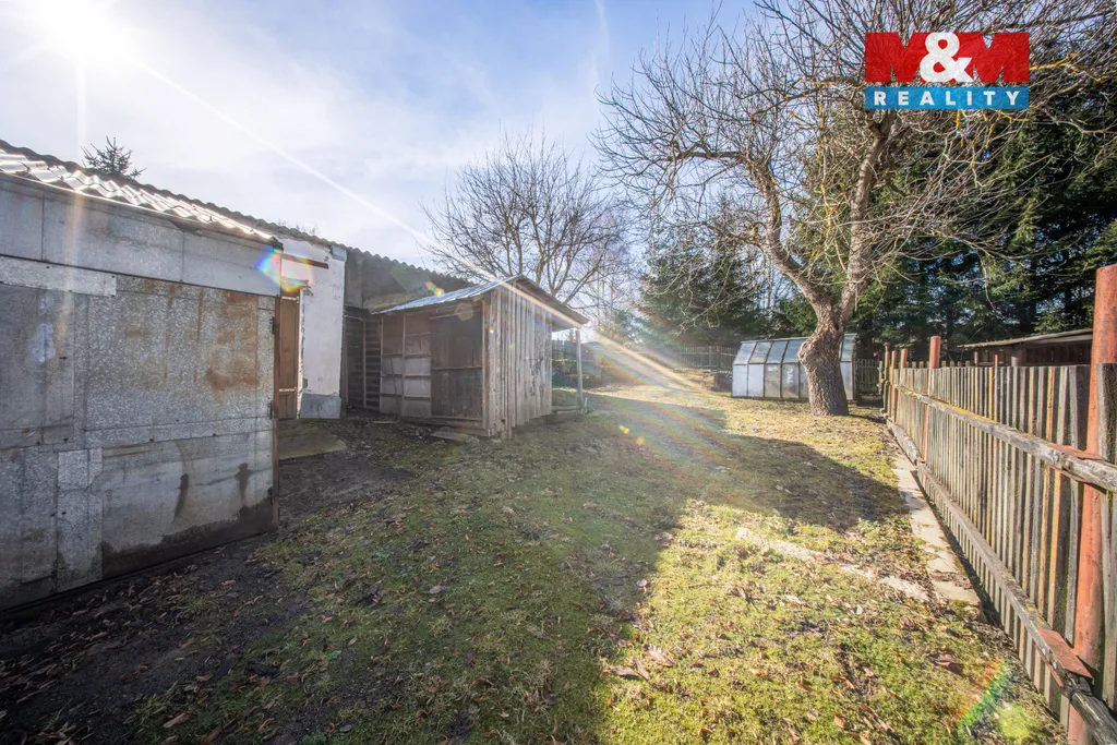 Za domem se nachází zahrada ve svahu, která nabízí možnost terénních úprav či vybudování teras. Na pozemku je kůlna, skleník, bouda pro psa a menší zahradní domek. U silnice stojí plechová garáž. Parkování je možné na vlastním pozemku pro 3–4 vozy.