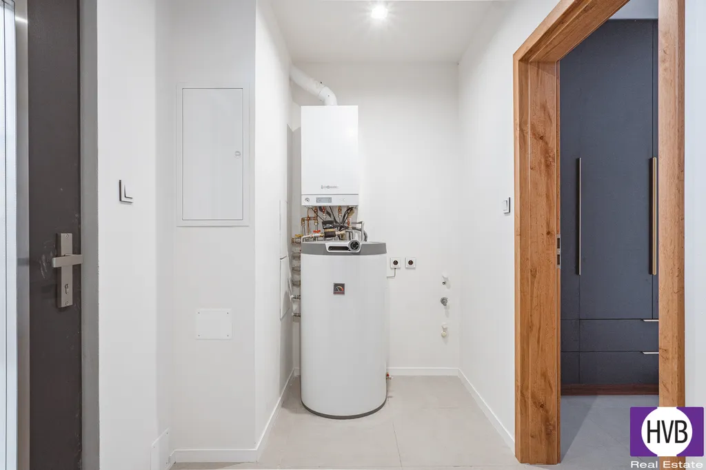 V přízemí se nachází prostorný obývací pokoj se vstupem na terasu a zahradu, plně vybavený kuchyňský kout (varná deska, digestoř, myčka, lednice) a koupelna se sprchovým koutem a WC. Nechybí technická místnost a dostatek úložného prostoru.