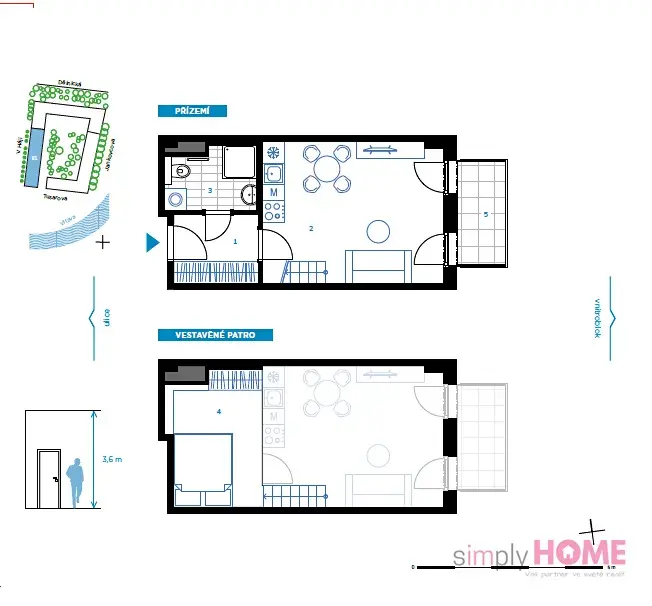 Byt je dispozičně řešený jako 1+kk s vestavěným patrem. Jeho celková plocha je 37 m2 a skládá se z prostorné předsíně, koupelny se sprchovým koutem a obývacího pokoje s kuchyňským koutem a patrem na spaní. Příslušenstvím bytu je prostorný balkón o ploše 4m2 a sklepní kóje v podzemním podlaží budovy rovněž o ploše 4 m2.