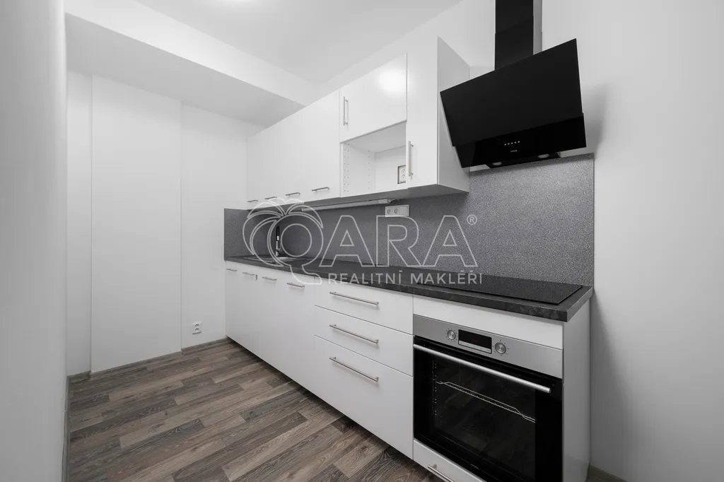 Byt je vybaven kuchyňskou linkou s vestavěnou troubou, indukční deskou a digestoří + místo pro mikrovlnou troubu.