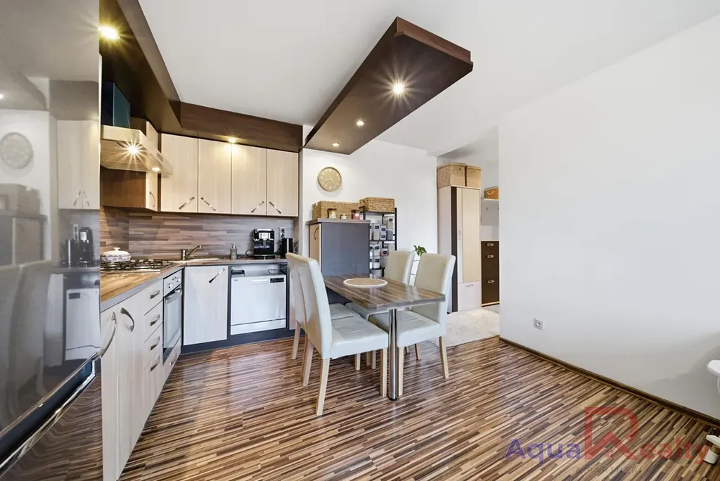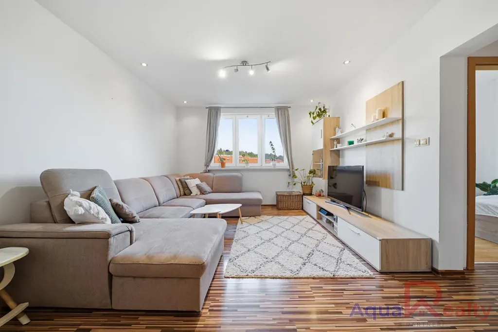 Samotný byt je velmi dobře udržovaný a v roce 2014 prošel rekonstrukcí ohledně nových omítek, osazení moderních interiérových dveří a provedení nových rozvodů elektřiny v mědi. Jedinečným prvkem interiéru je francouzské okno z PVC v ložnici, které místnosti dodává mimořádnou světlost a moderní charakter, zatímco v obytných místnostech jsou položeny plovoucí podlahy dodávající interiéru útulný vzhled. Kuchyňská linka disponuje designovým dřevěným podhledem s integrovaným bodovým osvětlením a celý prostor je vytápěn dálkovým rozvodem s topnými tělesy zabudovanými přímo ve zdech a stropu, takzvaným krytalovým topením, což nenarušuje čisté linie interiéru a výrazně usnadňuje budoucí rozmístění nábytku. Koupelna je vybavena sedací vanou, umyvadlem se zrcadlem a prostorem pro pračku i sušičku, přičemž toaleta je pro větší soukromí umístěna v oddělené části za zděnou příčkou. Prodej nemovitosti probíhá bez vnitřního vybavení, což novým majitelům otevírá možnost zařídit si interiér podle vlastních představ.