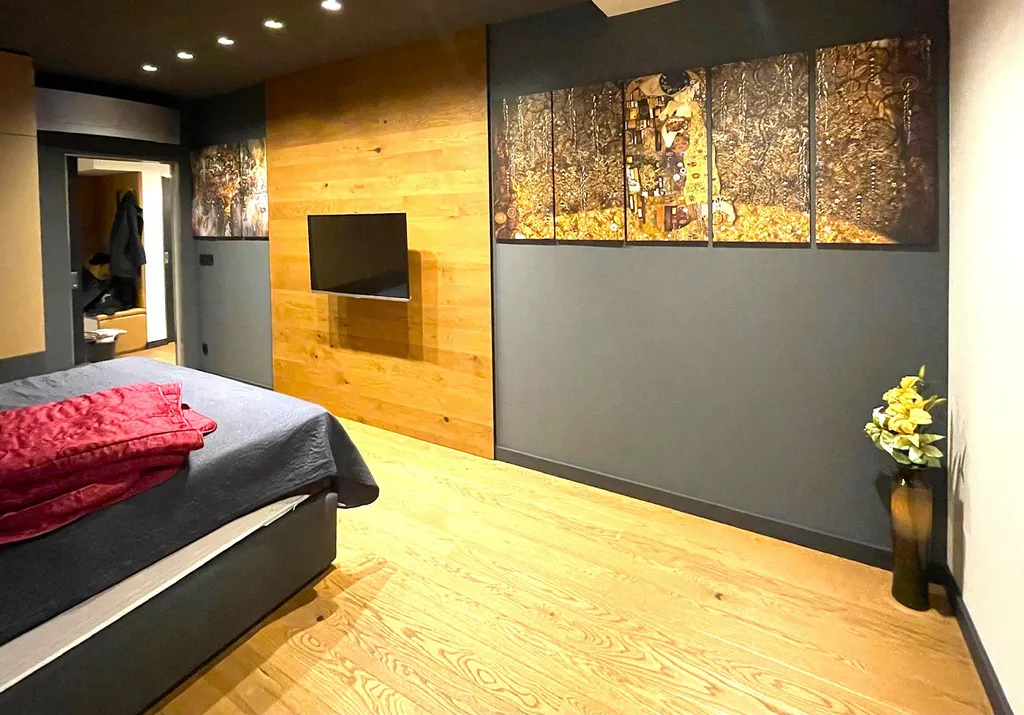 Kvalitní dřevěná dubová podlaha a velkoformátové obklady dodávají bytu moderní a luxusní vzhled. Posuvné dveře v pokojích a designové doplňky sanity v koupelně a na WC to jen umocňují.