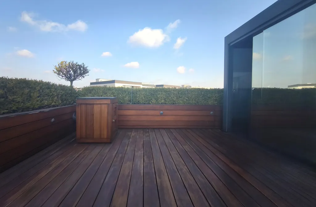 Terasa je po obvodu zastíněna živým plotem z buxusu s automatickou zálivkou a dřevěnou podlahou, což jen zvyšuje pohodlí a diskrétnost při jejím užívání.