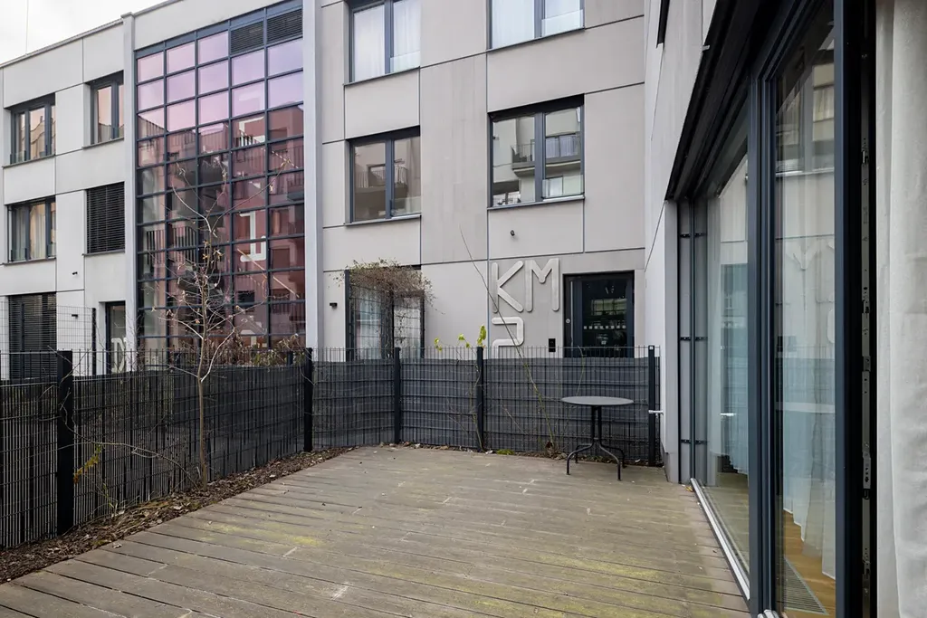 Světlý byt o dispozici 1+kk, 35 m² zaujme vysokými stropy, velkoformátovými okny a především nábytkem na míru promyšleným do posledního detailu. T pokoje je přímý vstup na terasu.