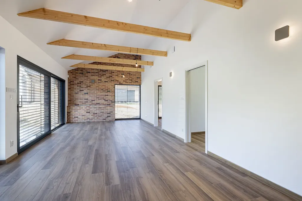 Interiér je promyšlený do posledního detailu – italská dlažba, luxusní koupelnové obklady, špičková sanita i stylové interiérové dveře Prüm. Velkoformátová posuvná okna HS Portál propojují vnitřní prostor s venkovní přírodou a dodávají domu vzdušnost a eleganci.