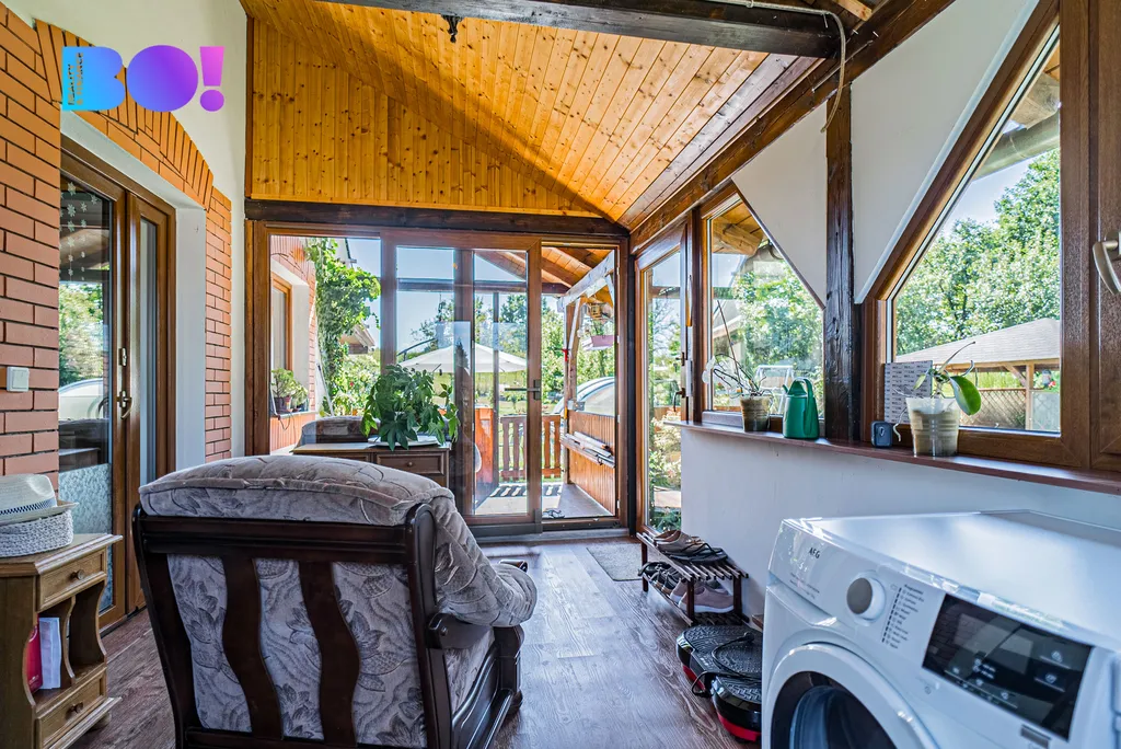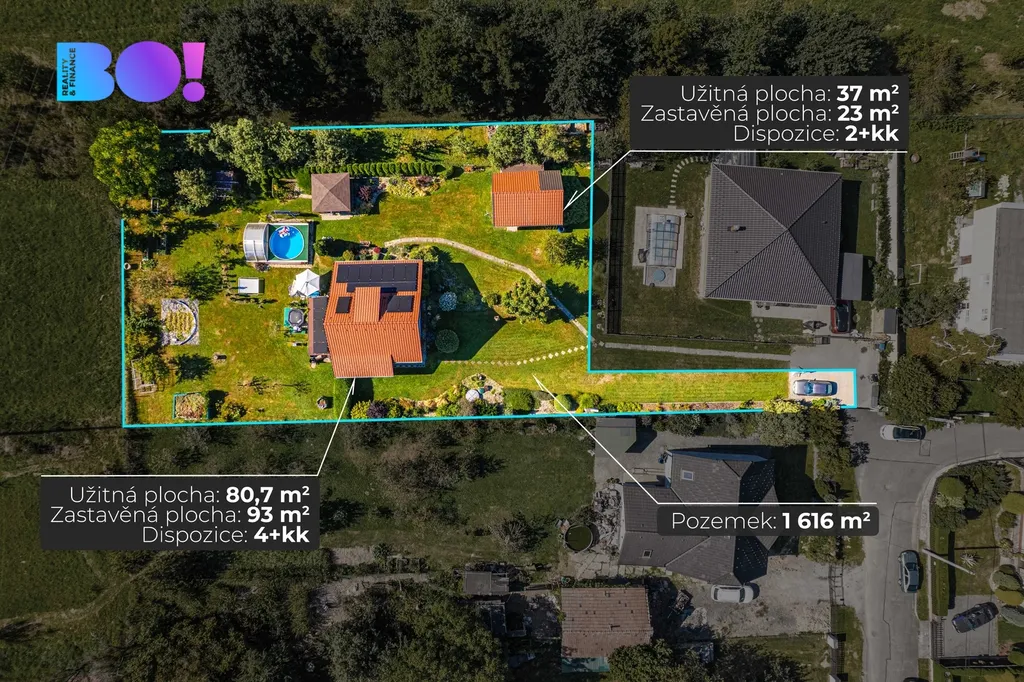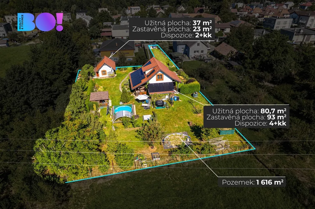 Nabízíme středně velký moderně stavěný cihlový rodinný dům s fotovoltaikou s nádherně upravenou zahradou s altánkem, krytým bazénem a druhým menším domem v rohu zahrady.