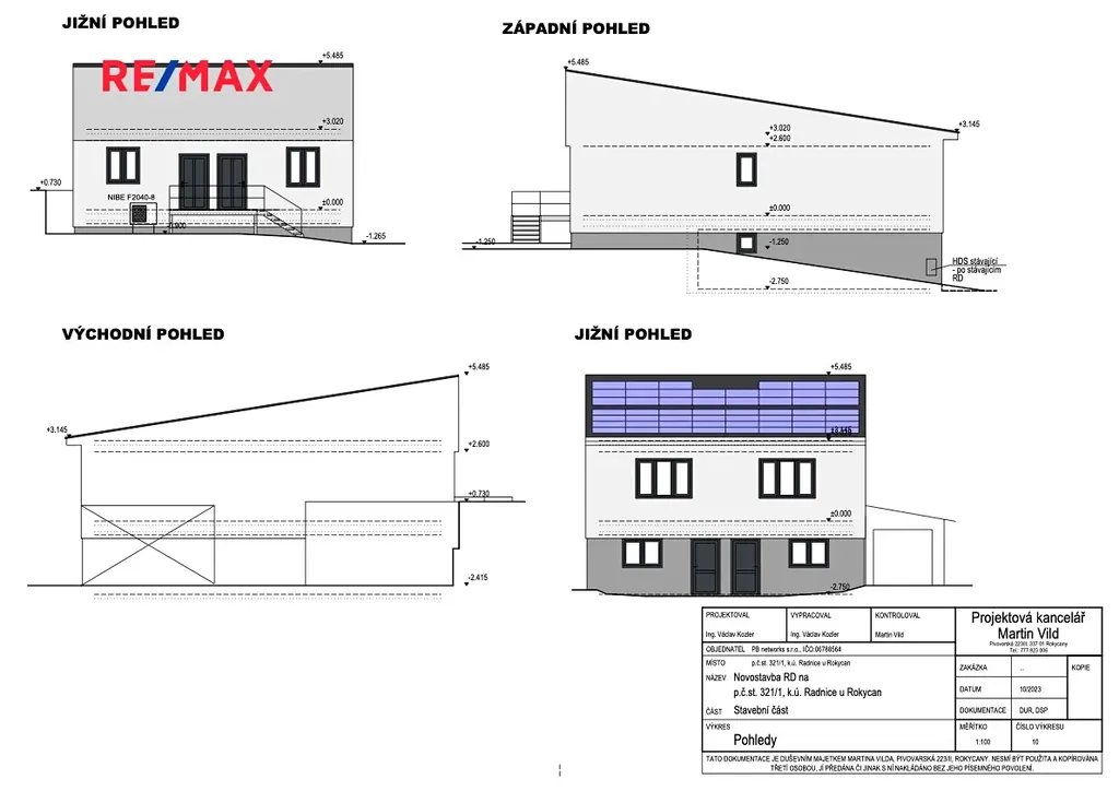 V 1.PP je prostorný sklep s denním světlem, který lze využít i jako pracovnu či fitness. Součástí 1.PP je i technické zázemí. K domu patří zahrada a o celkové výměře 478 m2. Vytápění je řešeno teplovodním podlahovým topením napojeným na tepelné čerpadlo NIBE, součástí je zásobník TUV. Na střeše budou instalovány fotovoltaické panely o výkonu 30 kWp, což zajišťuje velmi úsporný provoz domu. Dům spadá do energetické třídy A, což ho řadí mezi budovy s minimální náročností energie. Stavba je navržena jako zděná z keramických cihel POROTHERM (obvodové zdivo 300 mm, příčky 115 mm). Krov je z dřevěných vazníků, pultová střecha s plechovou falcovanou krytinou. Osazena budou plastová okna s trojskly, v exteriéru v barvě antracit, v interiéru bílá, doplněná o venkovní žaluzie. Vstupní dveře budou ve stejném barevném provedení. Podlahy obytných místností vinylové, v koupelně, na WC a v technické místnosti keramické dlažby. Pozemek bude oplocen pletivem a budou provedeny terénní úpravy. Zpevněné plochy budou ze zámkové a terasové dlažby.