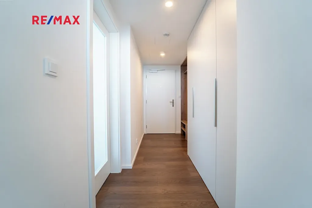 Byt je nabízen ve vysokém standardu, je zde velké množství úložného prostoru díky vestavěným skříním v předsíni a v ložnici. Do velké koupelny s vanou a toaletou se vchází přímo z ložnice, druhá toaleta má vstup z předsíně a je zde umístěna pračka a sušička.