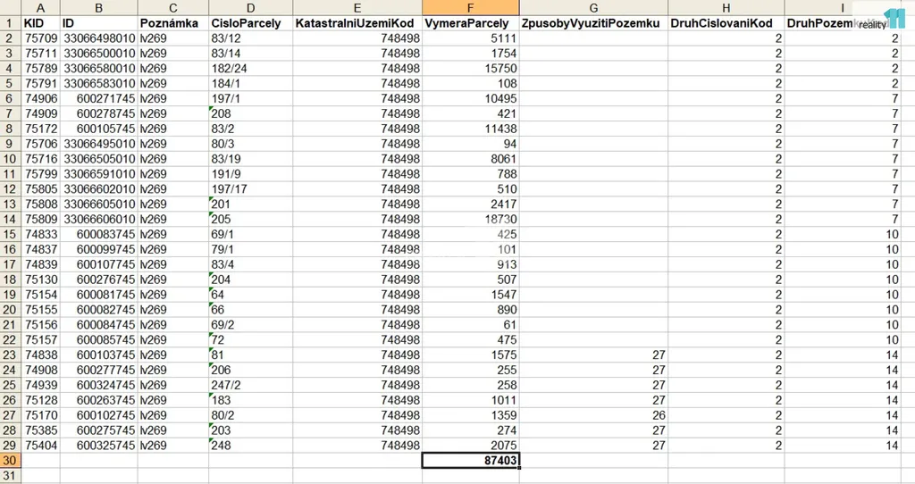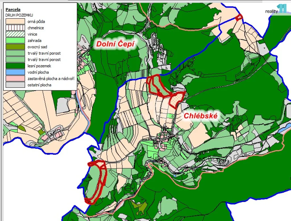 - lesní pozemek: 8 pozemků, celkem 4919 m²
