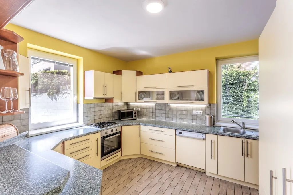 Kuchyňská linka je vybavena vestavěnými spotřebiči (plynová varná deska, digestoř, elektrická trouba, myčka). K topení lze použít plynové kamna, klimatizaci nebo interiérový krb.