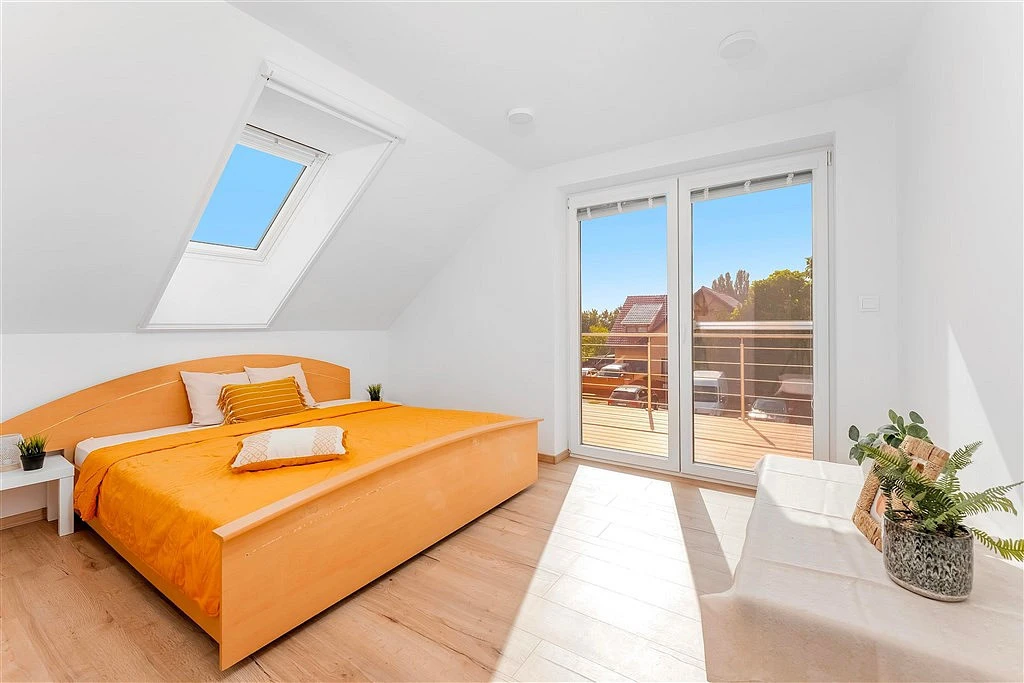 ___ Po masivních dřevěných schodech vyjdete do podkrovní haly, která nabízí vstup do čtyř pokojů a do koupelny s mohutnou rohovou vanou a WC. Tři pokoje jsou ve standardní velikosti kolem 12 m² a jeden má na podkroví úctyhodných 17 m². Ze dvou pokojů se dá vyjít prosklenými dveřmi na rozměrnou terasu (18,3 m²), s výhledem mj. i na Svatý kopeček.