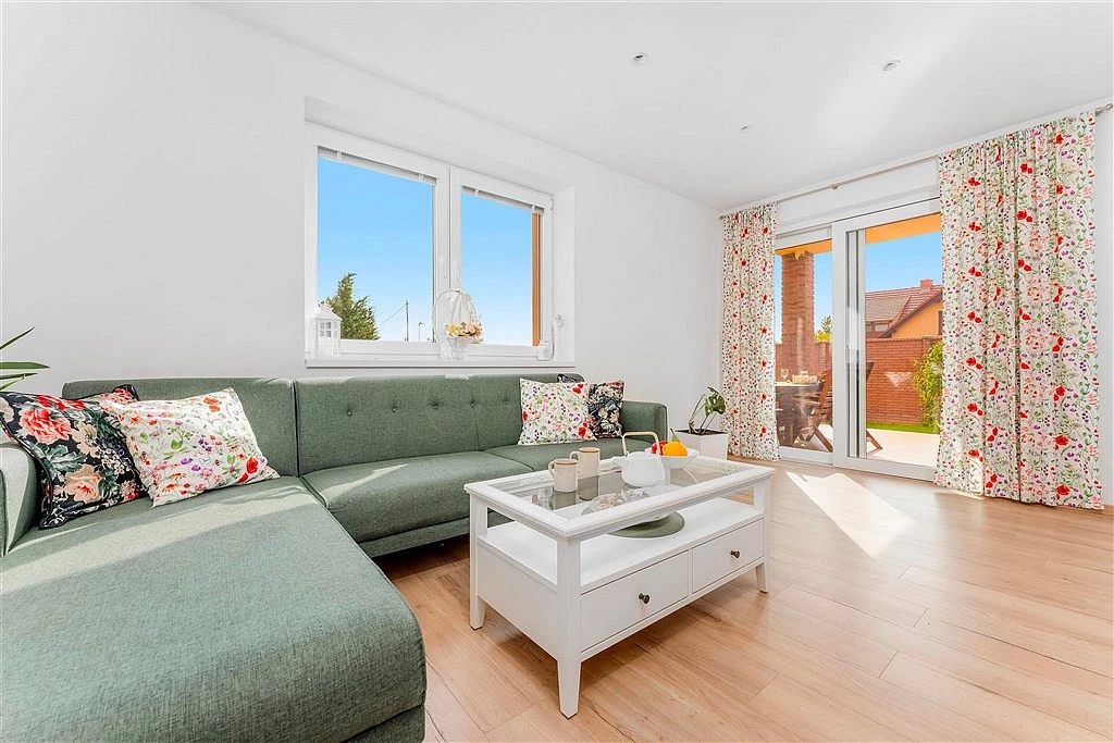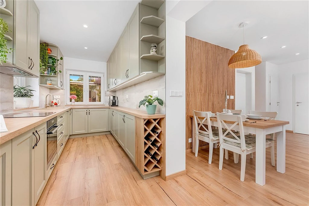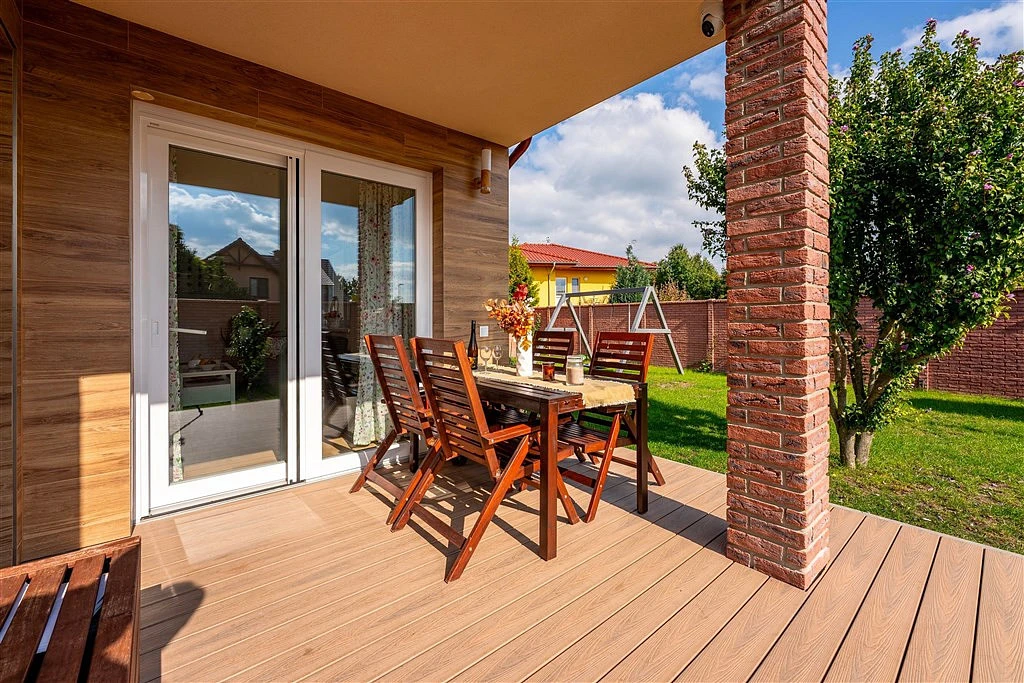 ___ Hlavní prostor domu tvoří obývací pokoj (26 m²) s přiléhající otevřenou kuchyní (10 m²). V kuchyni nová kuchyňská linka se všemi spotřebiči. Prostorný obývák zdobí stylový výkonný krb, přičemž teplo, které vytváří, je průduchy rozváděno do obou podlaží. Za portálovými balkónovými dveřmi navazuje na obývák jeho letní část, tj. zastřešená terasa s jídelním stolem, případně i s grilem, která tak zvětšuje obytný prostor domu o další metry.