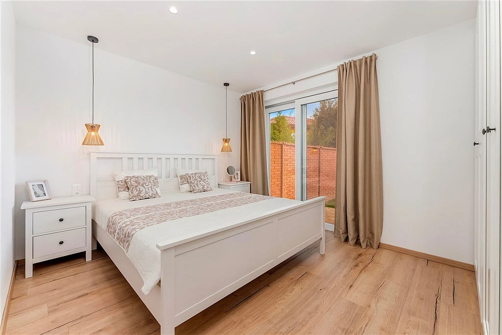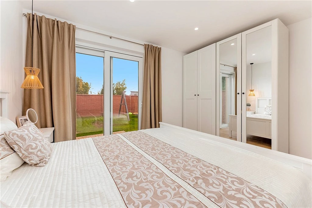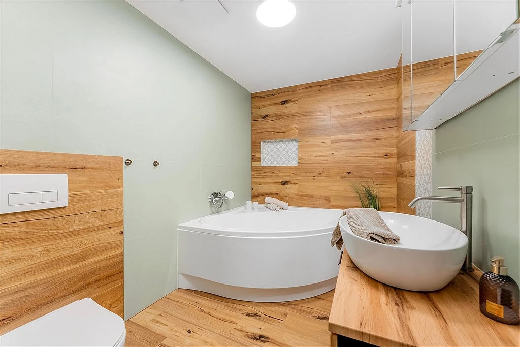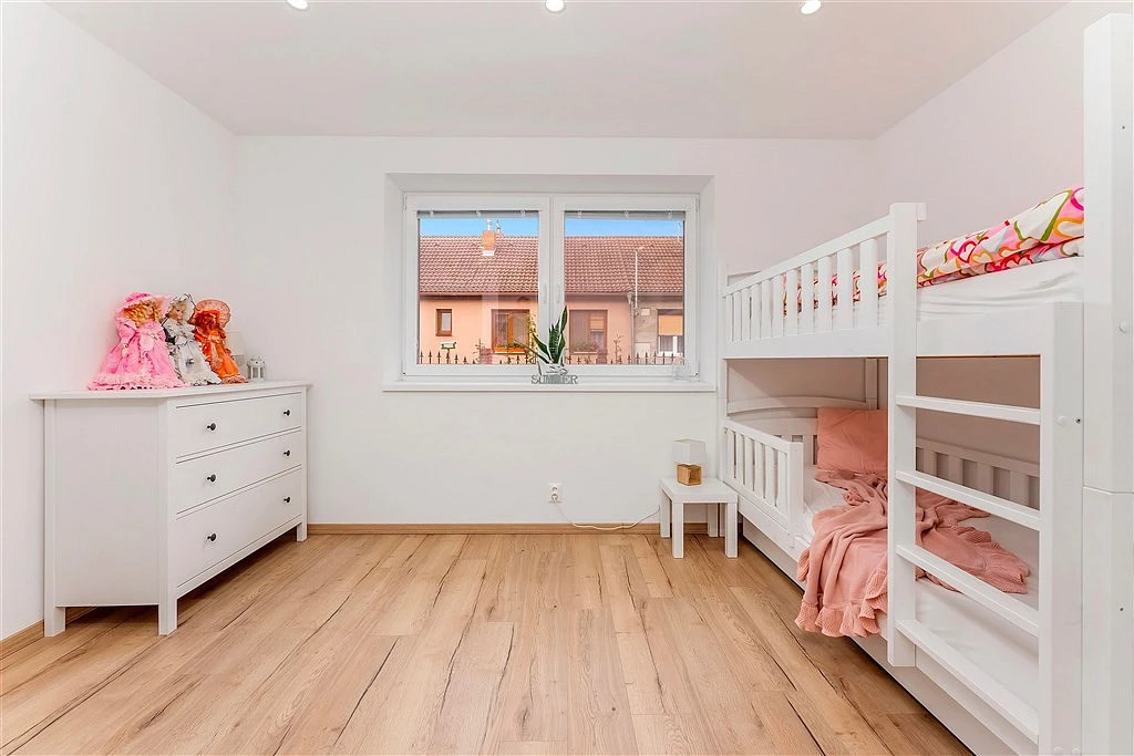 ___ Z obýváku přes zádveří vstoupíte do klidové části přízemí. Najdete zde jeden pokoj s okny do ulice a druhý pokoj/ložnice s prosklenými dveřmi, umožňujícími vstup přes menší terasu na zahradu. Mezi oběma pokoji je pak velmi pěkná koupelna s prosklenou sprchou a odtokovým žlabem. V technické místnosti, sloužící i jako komora, umístěné vedle předsíně, je elektrický kotel, pračka a je tam dost místa na sušičku i úklidové předměty.