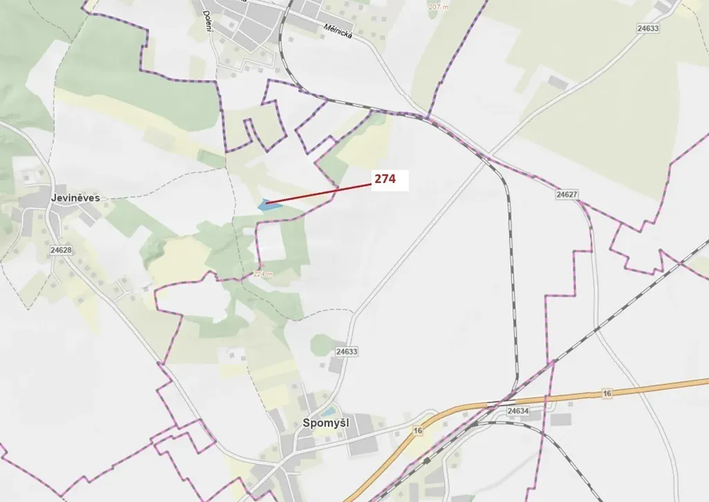Lesní pozemek o výměře 4 557 m2, parcelní číslo 274, podíl 1/1, katastrální území Jeviněves, obec Jeviněves, obec s rozšířenou působností Mělník, okres Mělník, Středočeský kraj.