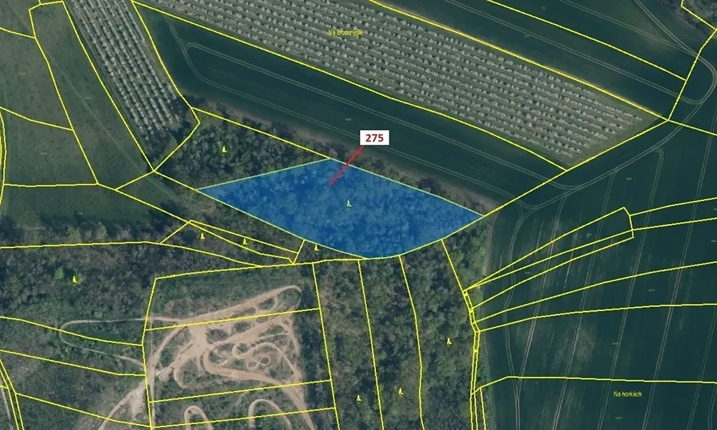 Lesní pozemek o výměře 10 319 m2, parcelní číslo 275, podíl 1/1, katastrální území Jeviněves, obec Jeviněves, obec s rozšířenou působností Mělník, okres Mělník, Středočeský kraj. Po těžbě.