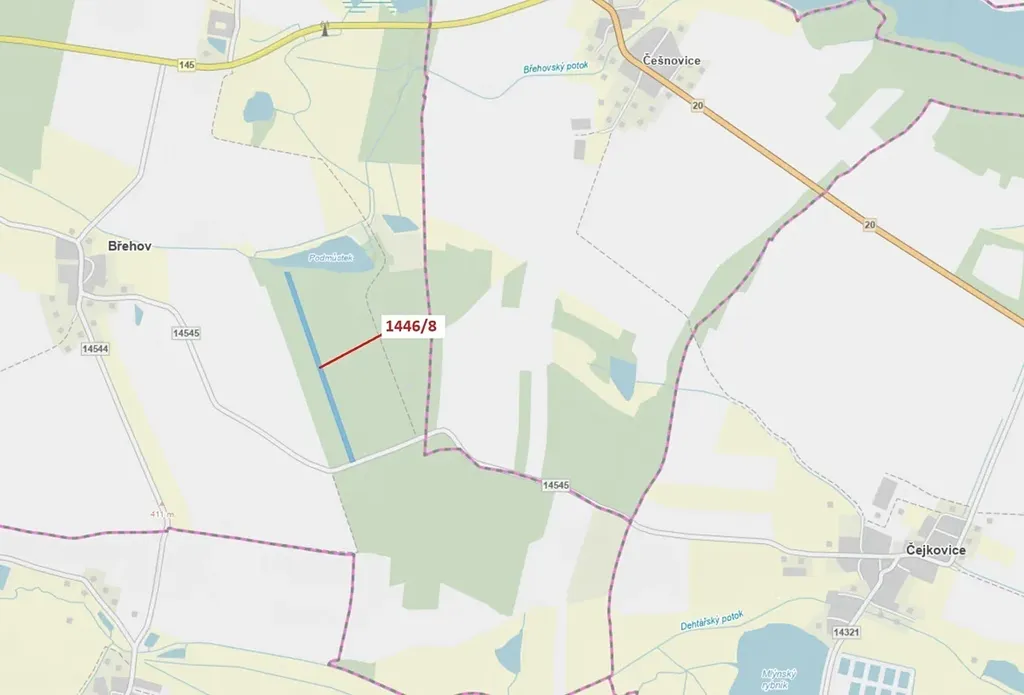 Lesní pozemek o výměře 20 146 m2, parcelní číslo 1446/8, podíl 1/1, katastrální území Břehov, obec Břehov, obec s rozšířenou působností České Budějovice, okres České Budějovice, Jihočeský kraj. Po těžbě.