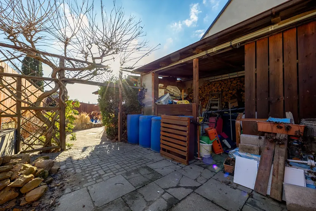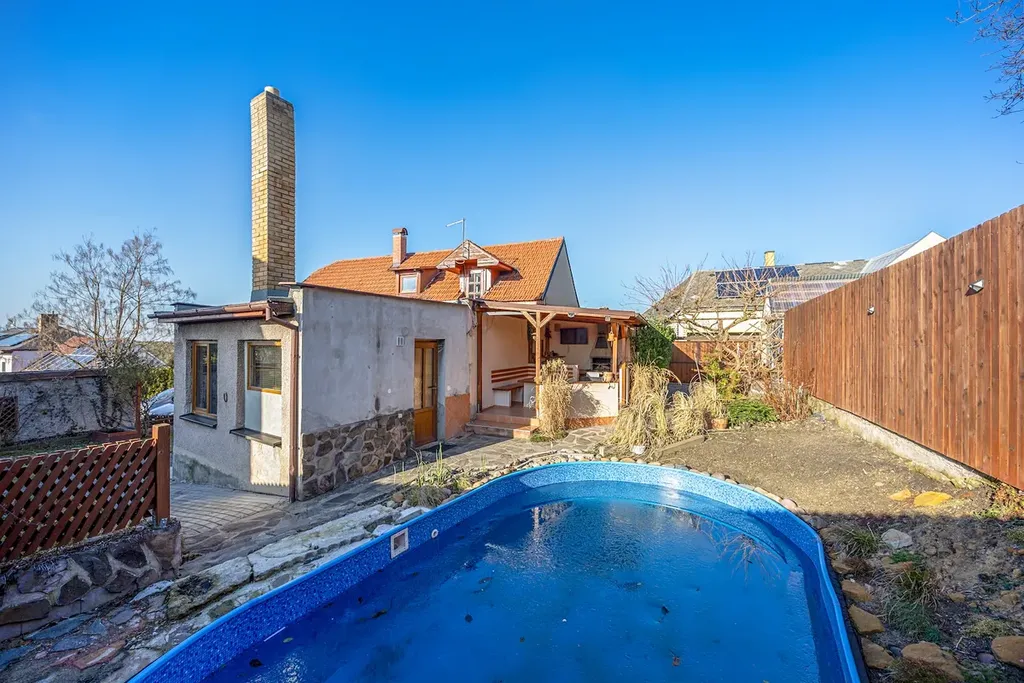 Součástí zahrady je zapuštěný vyhřívaný bazén, který prodlužuje koupací sezónu. Naproti bazénu je zastřešená pergola, ideální pro posezení nebo letní grilování.