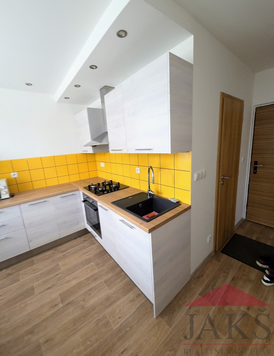 V kuchyni je kuchyňská linka včetně spotřebičů (sporák, trouba, digestoř, lednička), stůl a židle. Koupelna se sprchovým koutem, WC a pračkou. Nové podlahy.