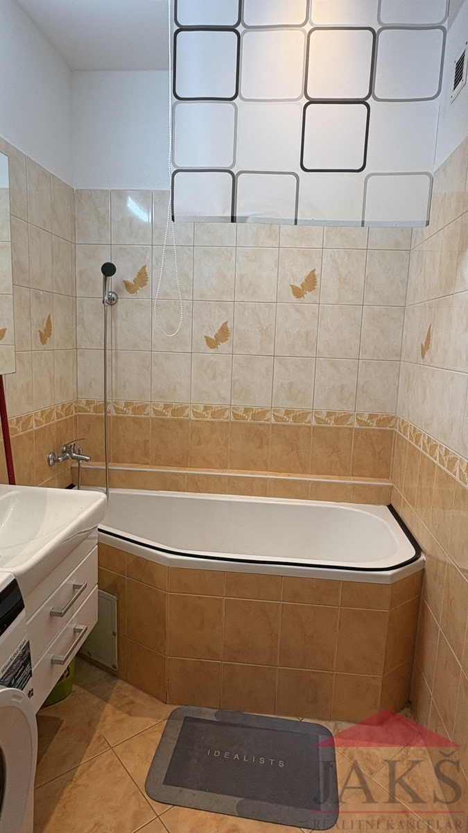 Popis: chodba (šatní skříň), zděná koupelna (rohová vana s rolovacím závěsem, umyv. se zrcadlem a skříňkou, pračka), samostatné WC, kuchyň (kuch. linka se spotřebiči: HV trouba se sklo-ker. deskou, lednice s mrazákem) a ložnice.