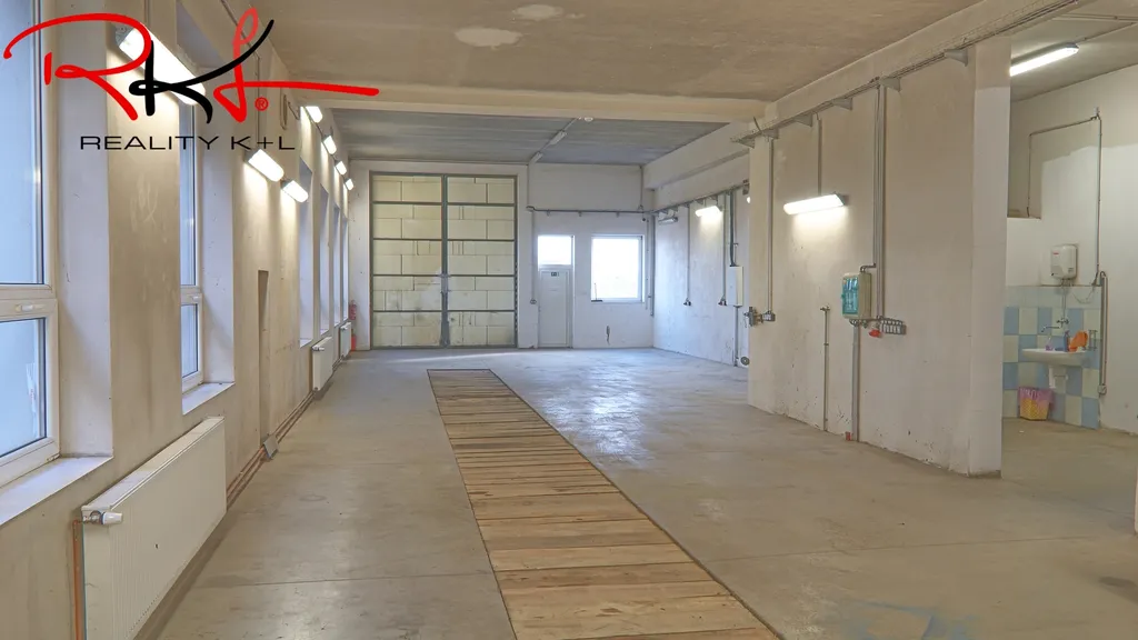 Dílna o celkové výměře 162 m², vybavená montážní jámou, se samostatným vstupem a vjezdovými plechovými vraty o výšce 4,5 m a samostatný zamykatelný sklad a sociální zařízení o výměře 36,34m2. Nájem – 43.800 Kč / měsíc, včetně energií.