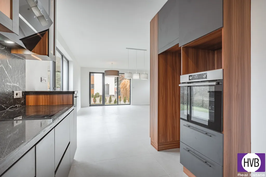 V přízemí domu se nachází hlavní obytná část – prostorný obývací pokoj propojený s kuchyní. Odtud je přímý vstup na terasu a zahradu. Kuchyňská linka je vybavena spotřebiči (varná deska, digestoř, myčka nádobí a lednice). Dále je v přízemí koupelna se sprchovým koutem a toaletou, technická místnost a úložné prostory.