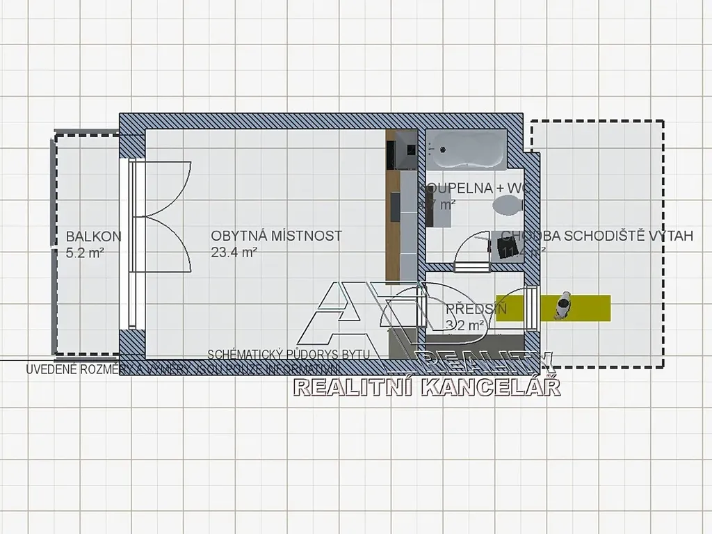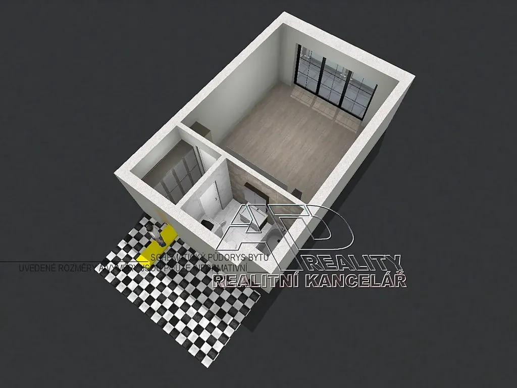 Dispozice: předsíň [3,3m2], obytná místnost s kuchyňským koutem [23,3m2] s balkonem [5,2m2], koupelna s WC [4,6m2]. K dispozici je sklepní koje v 1.NP (přízemí) objektu o výměře cca [2,8m2]. K dispozici je jedno vyhrazené kryté (vnitřní) parkovací místo pod domem.