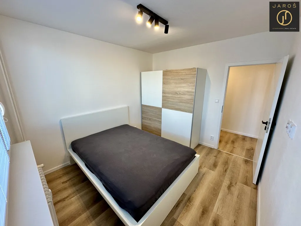Dispozice bytu nabízí prakticky řešený obývací pokoj s pohodlnou sedací soupravou, jídelním stolem a moderní kuchyňskou linkou vybavenou spotřebiči (lednice, myčka, indukční varná deska, elektrická trouba a vestavná mikrovlnná trouba). Součástí bytu jsou dále dvě samostatné ložnice, z nichž jedna disponuje manželskou postelí a prostornou šatní skříní. Koupelna je vybavena sprchovým koutem, toaleta je oddělena. V předsíni se nachází další vestavná skříň poskytující dostatek úložného prostoru.