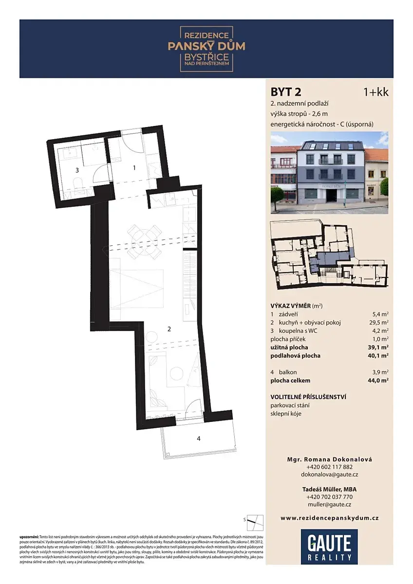 Jedná se o moderní bytovou jednotku s užitnou plochou 40,1 m² s vlastním balkonem o výměře 3,9 m², který je orientován do klidného vnitrobloku, na jihovýchodní stranu. Nabízí tak soukromý venkovní prostor pro odpočinek stranou od ruchu náměstí, přičemž si zachovává veškeré výhody bydlení v historickém srdci města.