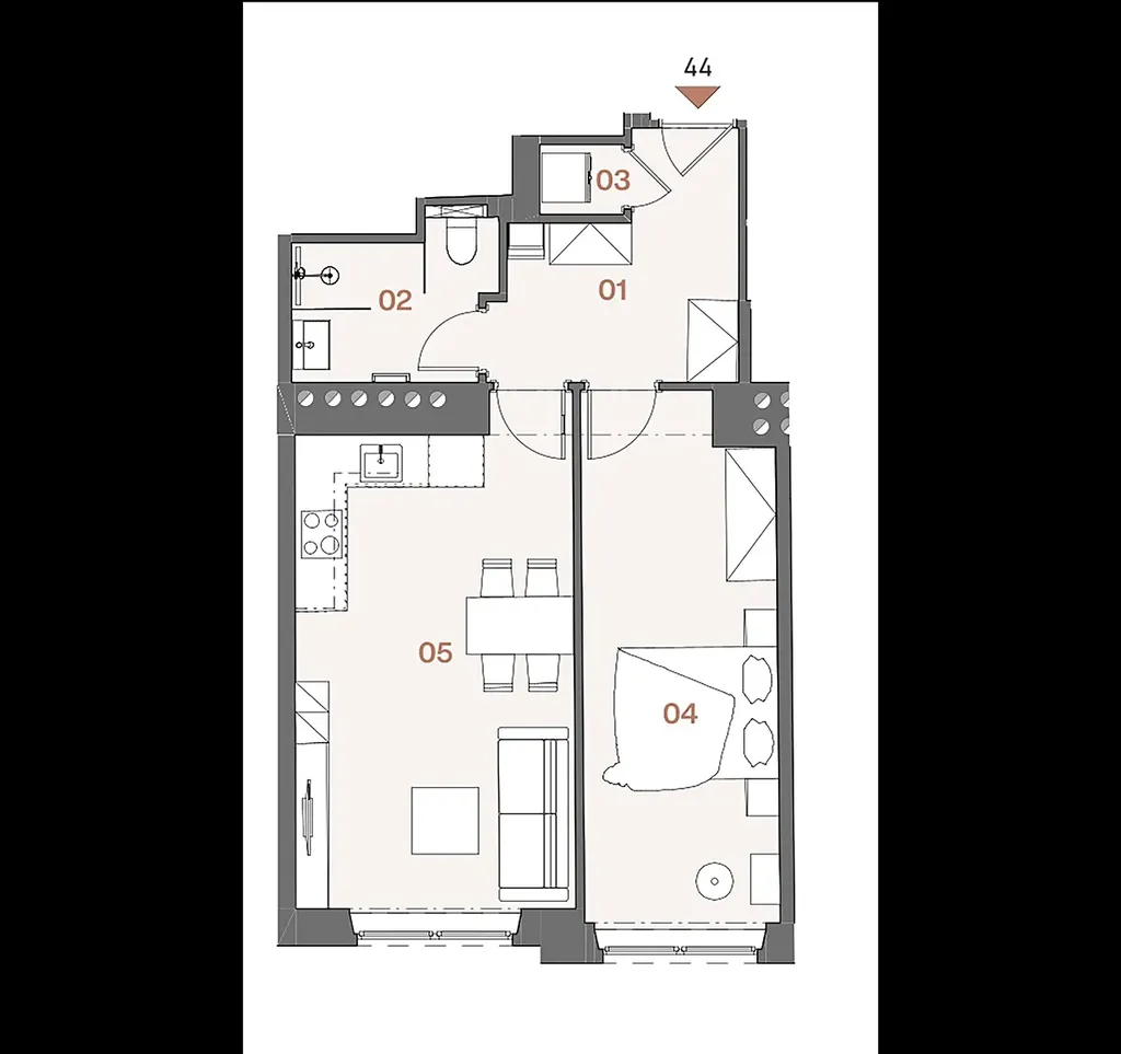 Půdorys bytu ve 4. podlaží zahrnuje obývací pokoj s přípravou na kuchyňskou linku, samostatnou ložnici, vstupní chodbu a koupelnu s toaletou. K jednotce náleží sklepní kóje, která poskytuje praktický úložný prostor navíc. Byt je dokončen v provedení fit out – s novou dřevěnou podlahou a nadčasovou koupelnou vybavenou sanitou značek Laufen a Grohe.