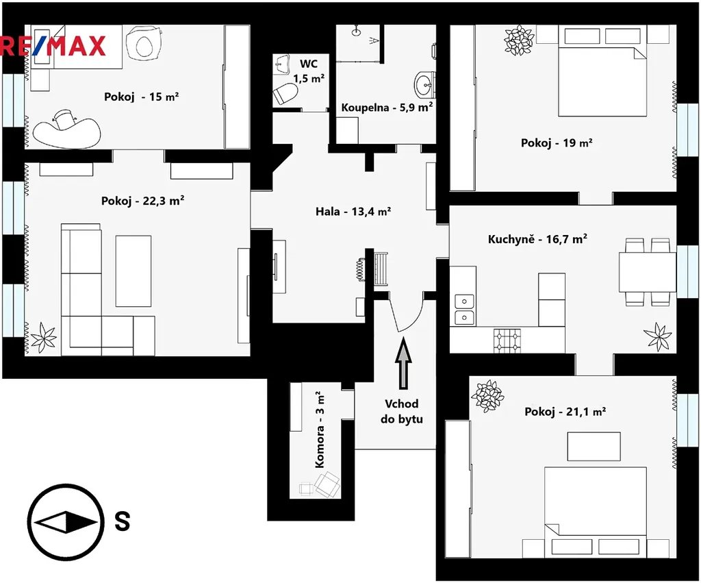 Plánek, půdorys bytu a také virtuální prohlídka jsou k dispozici ve fotogalerii.