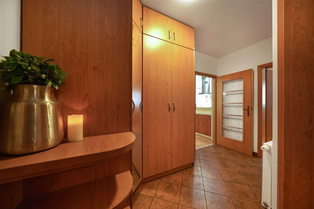 Dispozice bytu je řešena maximálně prakticky a ocení ji jak rodina, tak pár, který hledá komfortní a útulné bydlení. Hlavním prostorem je světlo zaplavený obývací pokoj s jídelnou a kuchyňským koutem, ze kterého vstoupíte přímo na terasu orientovanou do zahrady. Dále zde najdete dvě neprůchozí ložnice, velmi prostornou koupelnu s vanou i sprchovým koutem, samostatné WC a velkou předsíň s vestavěnými skříněmi.