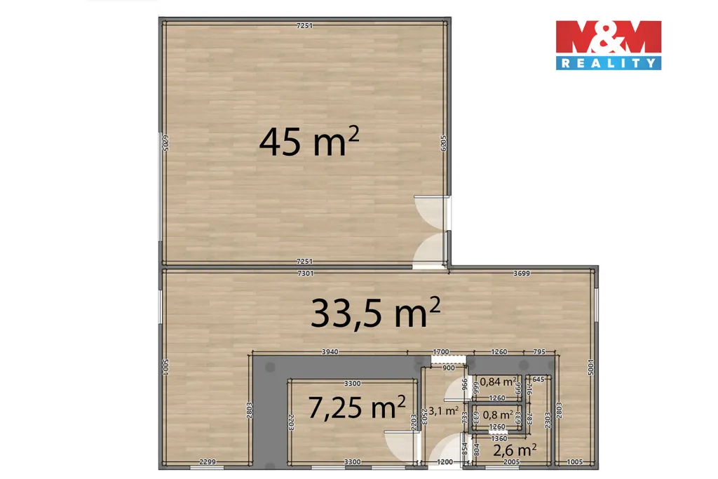 Dispozice a výměry: kancelář: 7,25 m², sociální zázemí