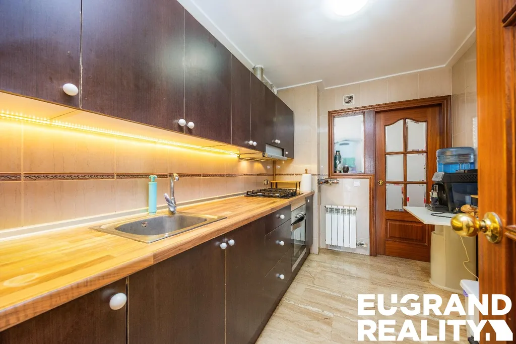 Dispozice bytu zahrnuje prostorný obývací pokoj s jídelnou, samostatnou kuchyň s prádelnou, 3 ložnice a 2 koupelny. Hlavní ložnice má vlastní koupelnu, další dvě ložnice sdílejí druhou koupelnu.