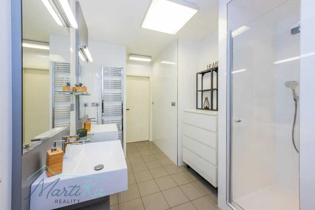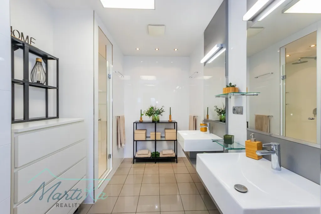 • koupelna 8,72 m² – dvě umyvadla, sprchový kout, místo pro pračku i sušičku