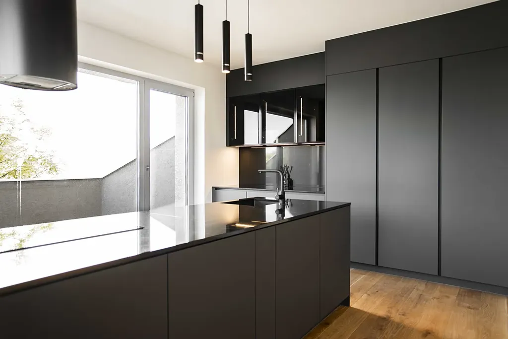 Dominantou hlavního obytného prostoru je designová kuchyně na míru od studia Tempus Design v lakovaném provedení Antracite mat. Luxusní charakter podtrhuje pracovní deska a obklad ze žuly Nero Assoluto s leštěným povrchem. Horní skříňky z kouřového skla s integrovaným LED podsvícením doplňuje kompletní sada vestavných spotřebičů BOSCH včetně kávovaru.