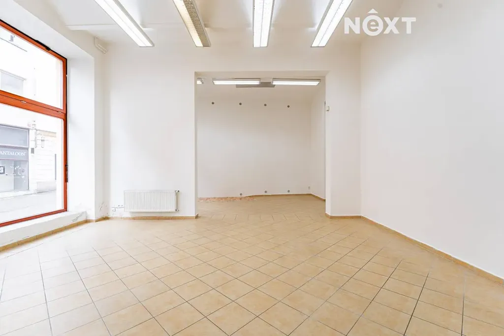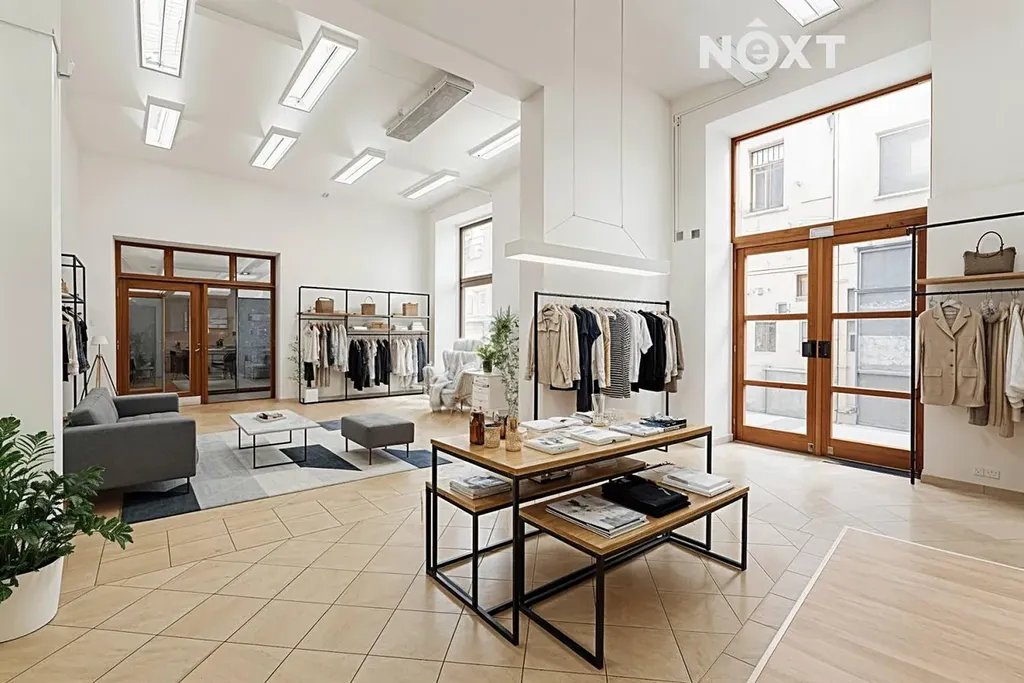 Prostor s výlohami má přímý vstup z pěší zóny a v minulosti sloužil jako prodejna. Dispozičně je řešen převážně jako otevřený prostor vhodný pro prodej nebo showroom, doplněný o menší zázemí a samostatnou místnost, kterou lze využít jako sklad, šatnu či menší kancelář.