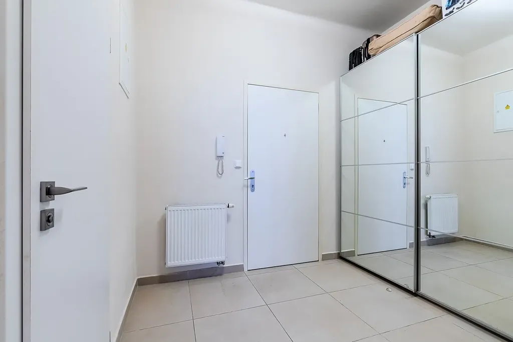 Kuchyňský kout je vybaven bílou klasickou kuchyní se spotřebiči (trouba, vestavěná mikrovlnná trouba, indukční deska) a místem pro jídelní stůl pro 4 osoby. Koupelna je moderní: sprchový kout se skleněnými dveřmi, závěsné WC, žebříkový vyhřívaný radiátor a pračka. Prostorná vstupní chodba se zrcadlovou posuvnou skříní nabízí nadstandardní úložné zázemí.