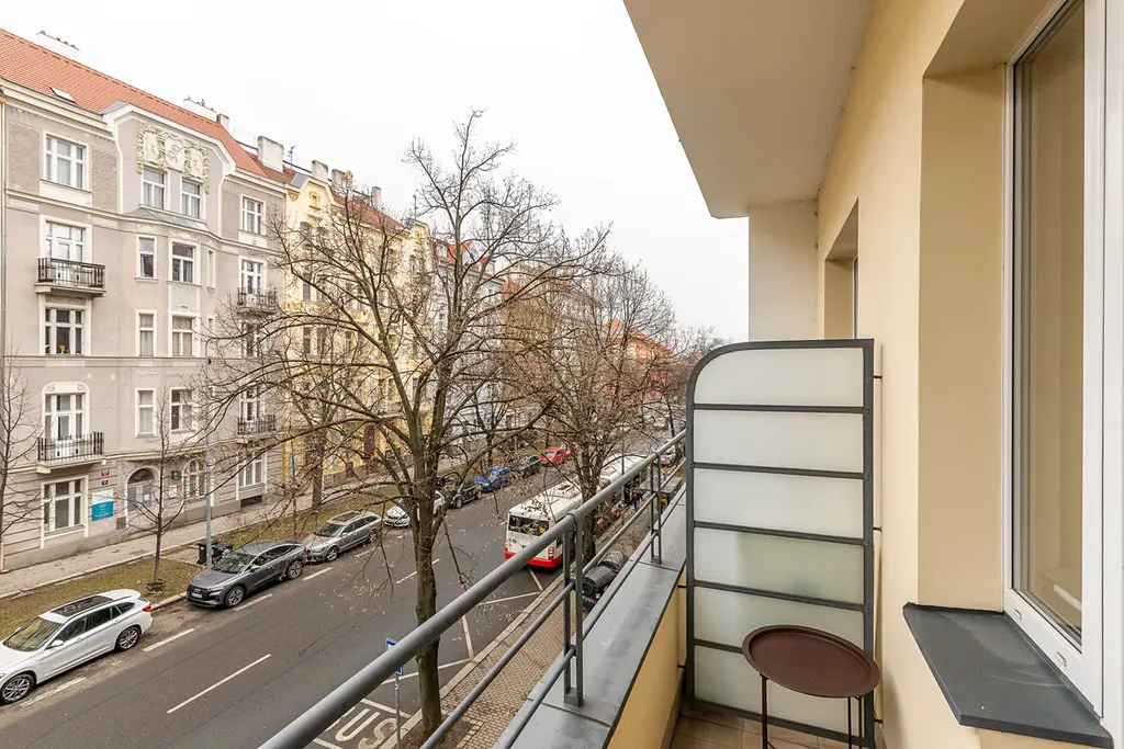 Byt má přehlednou dispozici se skutečně oddělenou ložnicí. Ložnice je útulná — parkety, velké okno, příjemná teplá atmosféra. Obývací pokoj s kuchyňským koutem je světlý a prostorný, s přístupem na balkon s výhledem do stromořadí a na typické vršovické secesní fasády naproti. Světlé parkety a krémové stěny působí harmonickým, vzdušným dojmem.