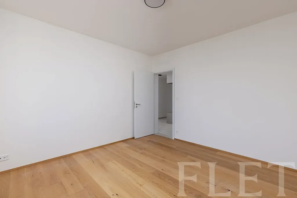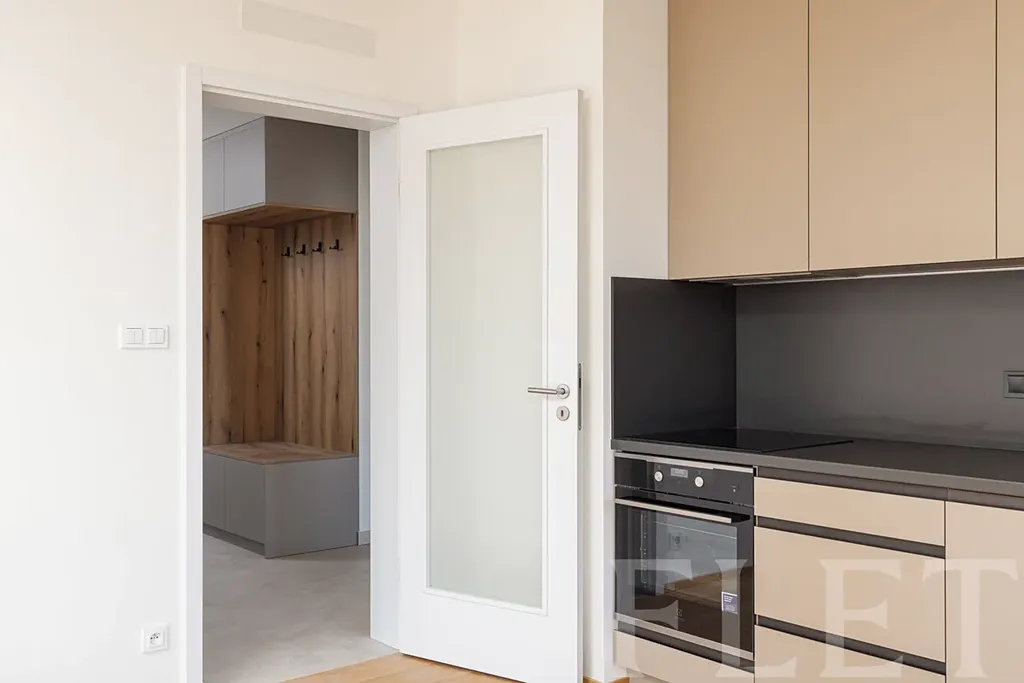 Dominantou bytu je prostorný obývací pokoj s kuchyňským koutem, který tvoří přirozené centrum celého bytu. Kuchyňská linka je vybavena moderními spotřebiči – indukční varnou deskou, troubou, digestoří s ventilací, myčkou a lednicí s mrazákem. Součástí bytu je také pračka a komfort bydlení doplňuje elektrické odvětrávání. Ložnice nabízí dostatek prostoru pro pohodlné spaní i úložné řešení a v předsíni se nachází praktická vestavěná skříň.