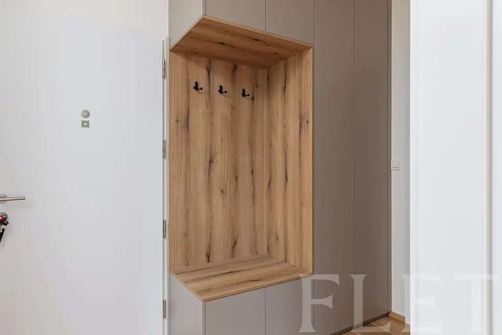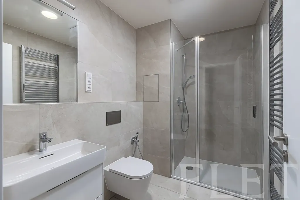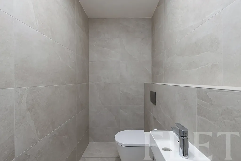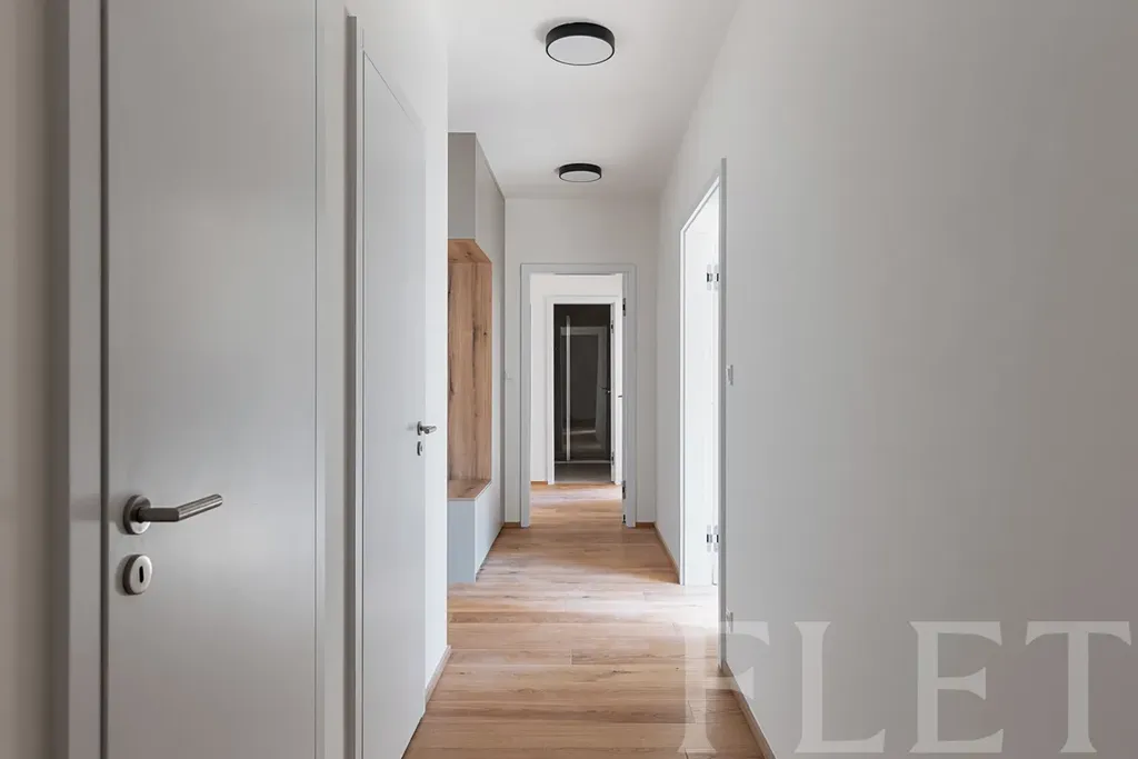 Dominantou bytu je prostorný obývací pokoj s kuchyňským koutem, který tvoří přirozené centrum celého bytu. Kuchyňská linka je vybavena moderními spotřebiči – indukční varnou deskou, troubou, digestoří, myčkou a lednicí s mrazákem. Dispozici dále doplňují tři samostatné pokoje, které mohou sloužit jako ložnice, dětské pokoje nebo pracovna. Velkým benefitem jsou dvě plnohodnotné koupelny – jedna se sprchovým koutem a toaletou, druhá s vanou, dvěma umyvadly a toaletou. Komfort každodenního fungování zvyšuje ještě samostatná toaleta a praktická technická místnost s pračkou. V domě je navíc k dispozici kočárkárna.