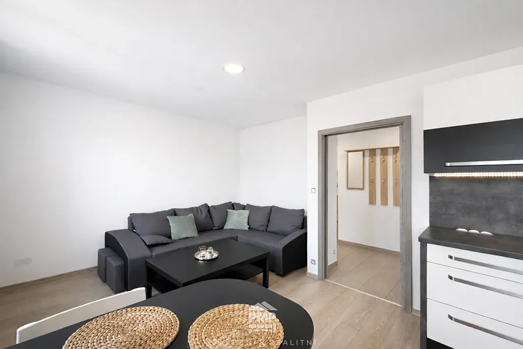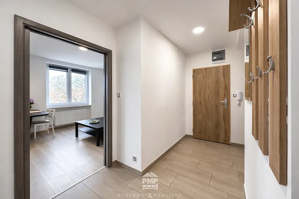 Interiér je prakticky řešený a připravený k okamžitému nastěhování. Byt se pronajímá kompletně vybavený - k dispozici jsou postele, šatní skříně, komody, sedací souprava, jídelní stůl se židlemi a TV.
