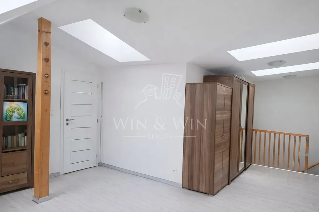 Horní patro zaujme svou světlostí díky množství střešních oken, která prostor zaplavují denním světlem. V patře je připravena instalace pro druhé sociální zařízení, a to přímo nad stávající koupelnou, což usnadňuje budoucí realizaci a výrazně zvyšuje komfort bydlení. Dispozici lze navíc jednoduchou úpravou rozšířit o další samostatný pokoj – ideální jako ložnice, dětský pokoj nebo pracovna.