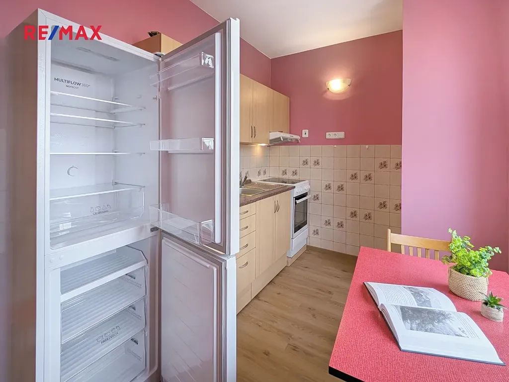V kuchyni je k dispozici kuchyňská linka vybavená elektrickou troubou, varnou deskou a novou lednicí.